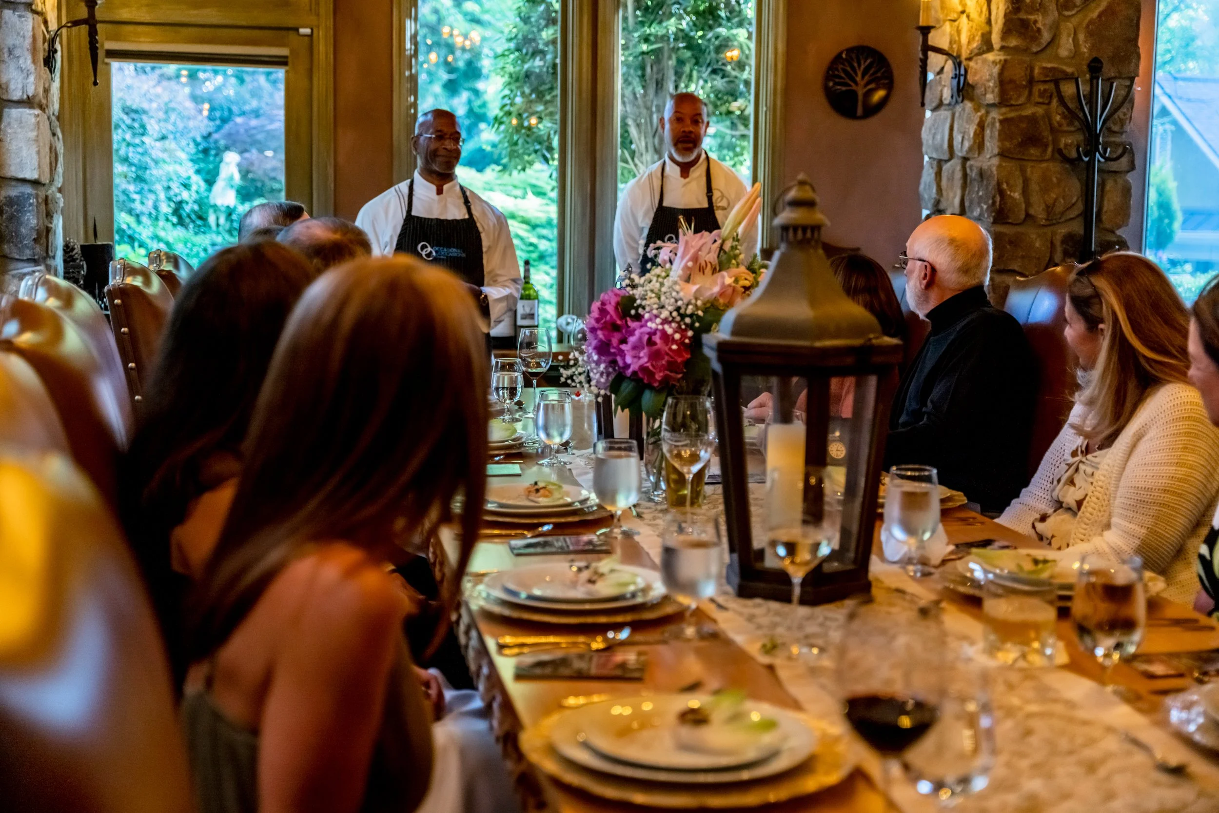 Our Chef’s Pavilion is perfect for a chef curated dinner for 18 guests or a catered buffet for up to 50 guests that can spill out into the fireplace patio